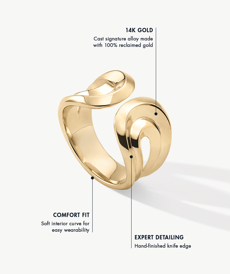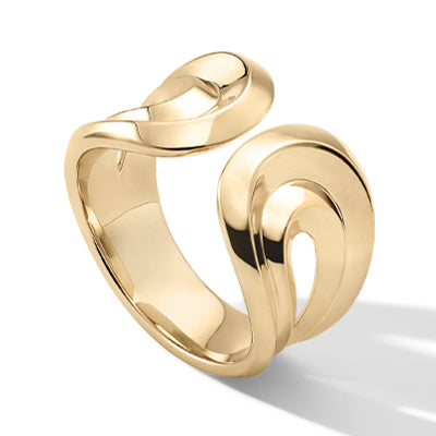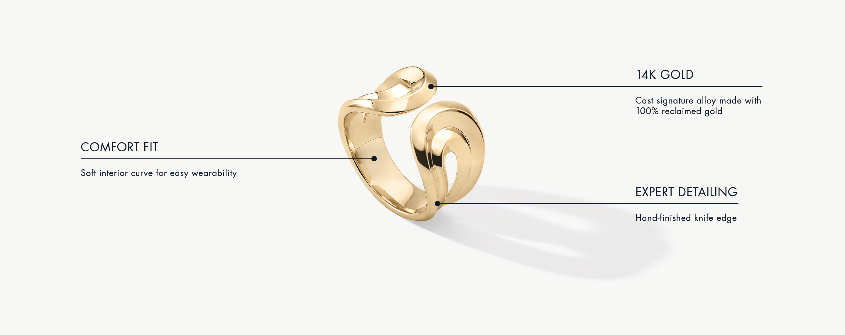With its lush curves and defiant edges the Fearless Muse Ring in solid gold by Alice Cicolini is a powerful contradiction. Its hourglass-like shape gives it an elegant form while the double knife detail captures the light and draws the eye.