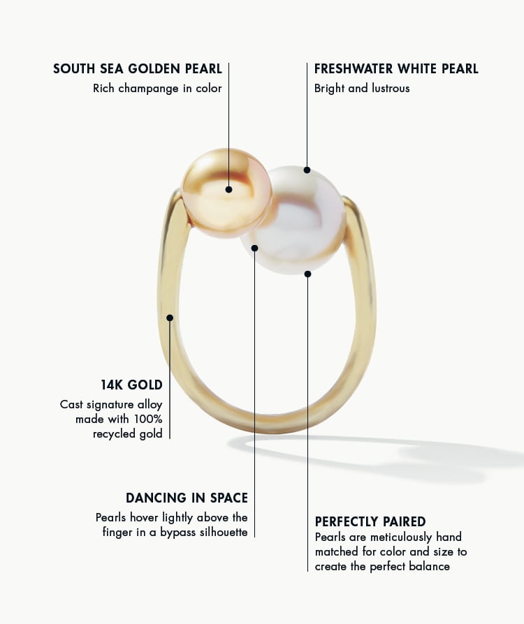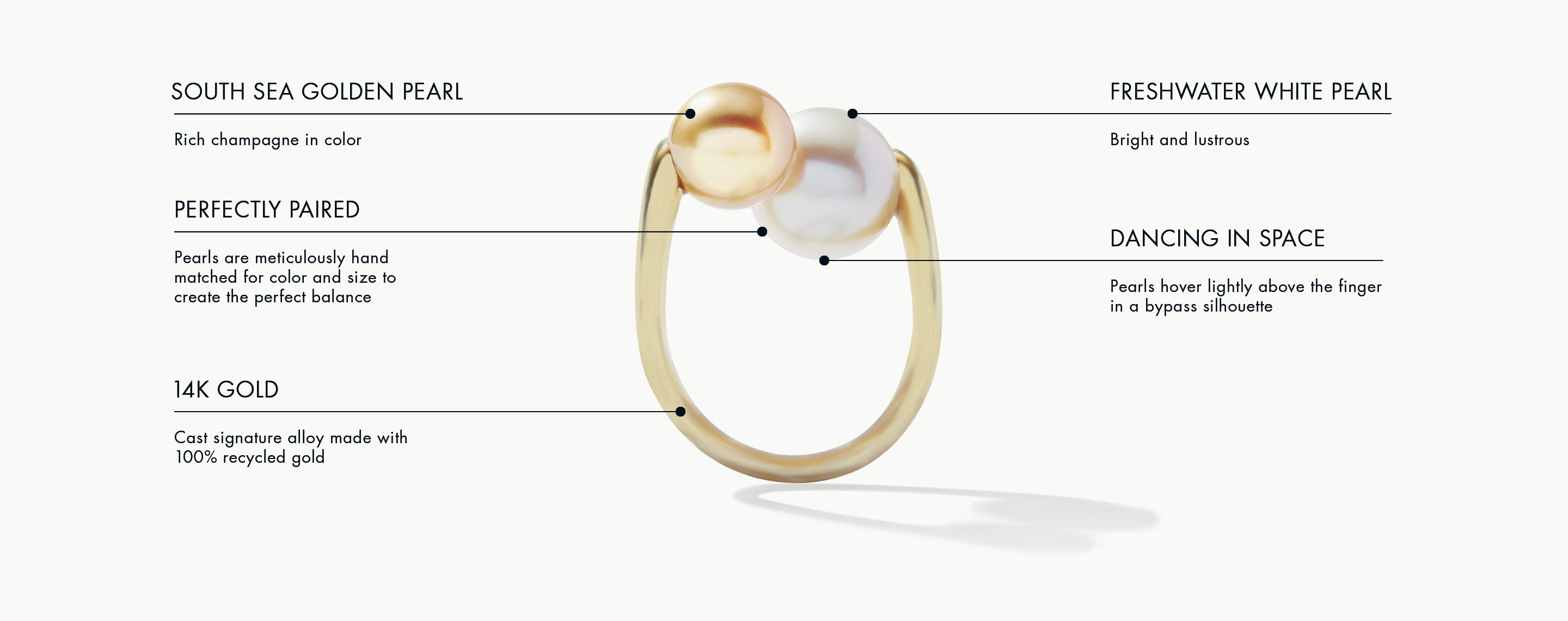 A lustrous duet of two-toned pearls hang suspended in space in The Daring Pirouette. A ring that’s form defies gravity and carries all the elegance of a fearless dancer. Inspired by the powerful artistry of ballet, this piece brings an artful spin to any look.